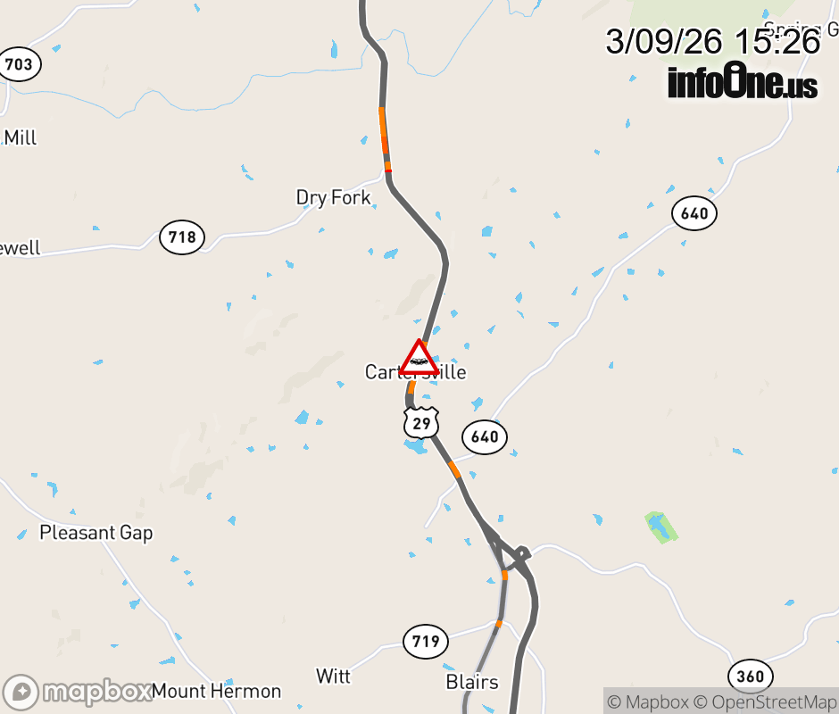 On US-29 in the County of Pittsylvania, in the vicinity of Toy Ln; Rt. 1123E/W (Pittsylvania County), motorists can expect delays due to a tractor trailer crash. The south left shoulder and left lane are closed. Updated: Mon 3/9/26 3:26 PM EDT ![]() Updated: Mon 3/9/26 3:26 PM EDT |