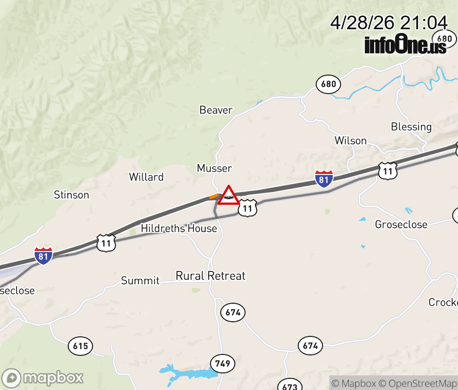 On I-81 at mile marker 60.8 in the County of Wythe, motorists can expect delays due to a vehicle crash. The south right lane, right shoulder, and exit ramp are closed. Updated: Tue 4/28/26 9:04 PM EDT ![]() Updated: Tue 4/28/26 9:04 PM EDT |