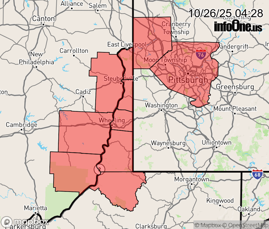 Canceled 10/26/25 9:00 AM Frost Advisory issued October 26 at 4:26AM EDT until October 26 at 9:00AM EDT by NWS Pittsburgh PA * WHAT... Temperatures as low as 33 will result in frost formation. Localized freezes also possible. * WHERE... In Ohio, Belmont, Jefferson OH, and Monroe Counties. In Pennsylvania, Beaver and Allegheny Counties. In West Virginia, Hancock, Wetzel, Brooke, Marshall, and Ohio Counties. * WHEN... Until 9 AM EDT this morning. * IMPACTS... Frost could harm sensitive outdoor vegetation. Sensitive outdoor plants may be killed if left uncovered. ![]() |
