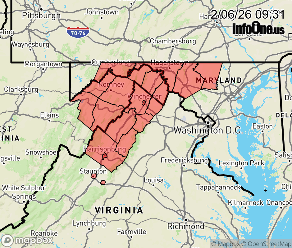 Canceled 2/6/26 12:52 PM High Wind Warning issued February 6 at 9:29AM EST until February 7 at 7:00PM EST by NWS Baltimore MD/Washington DC * WHAT... For the High Wind Warning, northwest winds 20 to 30 mph with gusts up to 60 mph expected. For the Cold Weather Advisory, very cold wind chills as low as 10 to 20 degrees below zero expected. * WHERE... Portions of north central and western Maryland, northwest and western Virginia, and eastern and panhandle West Virginia. * WHEN... For the High Wind Warning, from 4 AM to 7 PM EST Saturday. For the Cold Weather Advisory, from 4 AM Saturday to 10 AM EST Sunday. * IMPACTS... Damaging winds will blow down trees and power lines. Widespread power outages are expected. Travel will be difficult, especially for high profile vehicles. The dangerously cold wind chills as low as 20 below zero could cause frostbite on exposed skin in as little as 30 minutes. * ADDITIONAL DETAILS... Wind chills will remain at or below zero during the day on Saturday due to windy conditions and cold temperatures. ![]() |