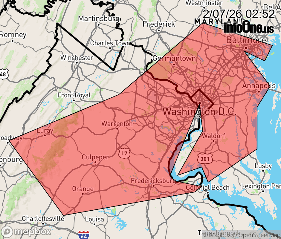 Canceled 2/7/26 3:15 AM Special Weather Statement issued February 7 at 2:51AM EST by NWS Baltimore MD/Washington DC At 249 AM EST, snow showers were located along a line extending from near Conowingo to near Severna Park to 10 miles northwest of Stafford to Shenandoah. Movement was southeast at 45 mph. Winds in excess of 30 mph are possible with these snow showers. Locations impacted include... Baltimore, Arlington, Alexandria, Stafford, Columbia, Germantown, Centreville, Waldorf, Dale City, Rockville, Bethesda, Gaithersburg, Reston, Bowie, Severn, Leesburg, Annandale, Annapolis, Clinton, and Olney. This includes the following highways... Interstate 70 in Maryland between mile markers 68 and 93. Interstate 95 in Maryland between mile markers 1 and 62. Interstate 97 in Maryland between mile markers 1 and 8. Interstate 270 in Maryland between mile markers 1 and 21. Conditions can deteriorate rapidly in winter weather situations. Be prepared for snow or ice covered roads. Slow down and allow extra time when traveling. ![]() |