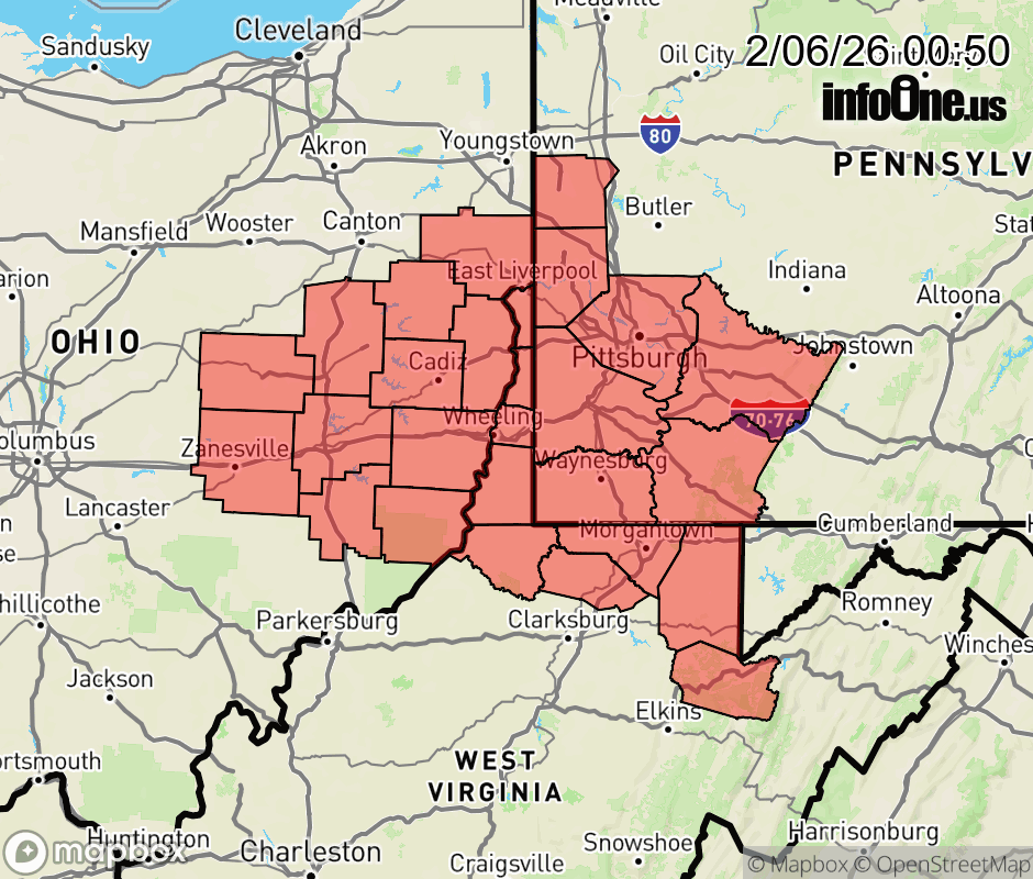Canceled 2/6/26 10:26 AM Cold Weather Advisory issued February 6 at 12:49AM EST until February 8 at 10:00AM EST by NWS Pittsburgh PA * WHAT... Very cold wind chills as low as 20 below zero expected. * WHERE... Portions of east central Ohio, southwest and western Pennsylvania, and northern and the northern panhandle of West Virginia. * WHEN... From 1 AM Saturday to 10 AM EST Sunday. * IMPACTS... The dangerously cold wind chills as low as 20 below zero could cause frostbite on exposed skin in as little as 30 minutes. ![]() |