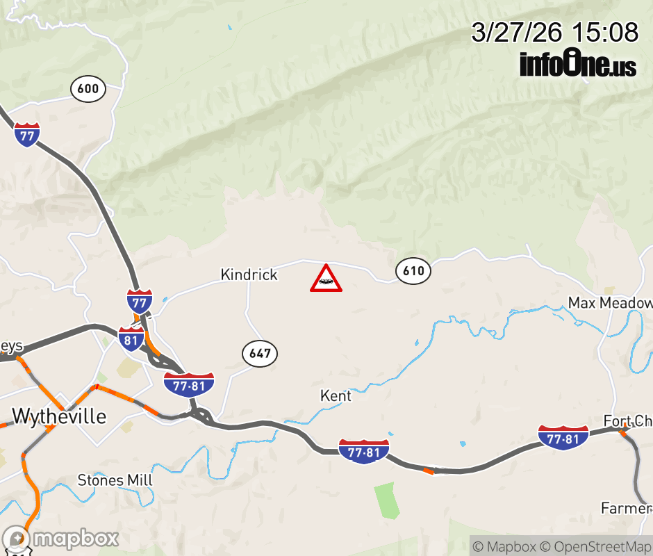On Rt. 792 North in the County of Wythe, in the vicinity of Peppers Ferry Rd; Rt. 610E/W (Wythe County), motorists can expect delays due to a vehicle crash. Lane closures exist. Updated: Fri 3/27/26 3:08 PM EDT ![]() Updated: Fri 3/27/26 3:08 PM EDT |
