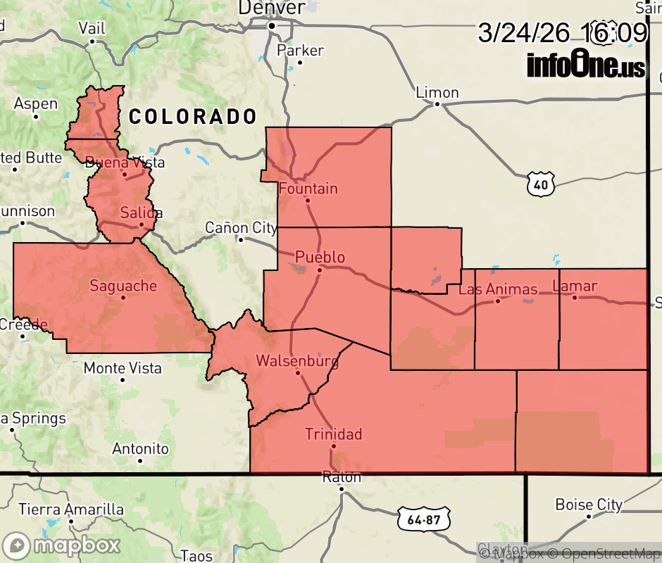 Canceled 3/25/26 1:42 AM Fire Weather Watch issued March 24 at 2:08PM MDT until March 26 at 8:00PM MDT by NWS Pueblo CO * AFFECTED AREA... Fire Weather Zones 220, 227, 228, 229, 230, 231, 232, 233, 235, 236 and 237. * WINDS... Northwest 15 to 25 mph with gusts up to 40 mph. * RELATIVE HUMIDITY... As low as 6 percent. * IMPACTS... Fires will catch and spread quickly. Exercise extreme caution with any outdoor burning. ![]() |