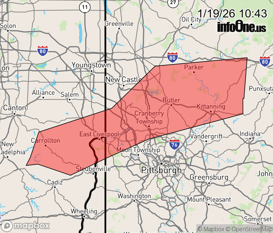 Canceled 1/19/26 10:56 AM Snow Squall Warning issued January 19 at 10:41AM EST until January 19 at 11:30AM EST by NWS Pittsburgh PA At 1041 AM EST, a dangerous snow squall was located along a line from 11 miles north of Shanor-Northvue to near Carrollton, or along a line from 14 miles north of Butler to near Carrollton, moving east at 45 mph. HAZARD...Intense bursts of heavy snow and gusty winds leading to blowing snow and rapidly falling visibility. Wind gusts up to 35 mph. SOURCE...Radar indicated. IMPACT...Travel will become difficult and potentially dangerous within minutes. Locations impacted include... Cranberry, Weirton, Butler, Franklin Park, East Liverpool, Aliquippa, Beaver Falls, Monaca, Kittanning, Wellsville, Carrollton, Rimersburg, Economy, Ellwood City, Ambridge, Wexford, Homeacre-Lyndora, New Brighton, Toronto and Shanor-Northvue. ![]() |