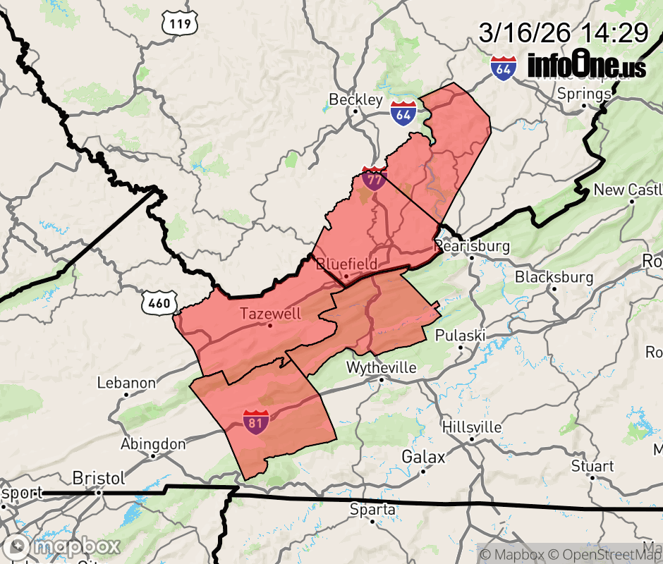 Canceled 3/16/26 7:22 PM Winter Weather Advisory issued March 16 at 2:27PM EDT until March 17 at 2:00AM EDT by NWS Blacksburg VA * WHAT... Snow accumulation between 1 and 3 inches...the heaviest amounts across the mountain ridges. Winds gusting as high as 40 mph. * WHERE... In Virginia, Bland, Smyth, and Tazewell Counties. In West Virginia, Mercer and Summers Counties. * WHEN... Until 2 AM EDT Tuesday. * IMPACTS... Plan on slippery road conditions. The hazardous conditions could impact the Monday evening commute. * ADDITIONAL DETAILS... Rapidly falling temperatures are expected this afternoon with rain showers changing to snow. Snow is expected to accumulate across the higher elevations this evening. ![]() |