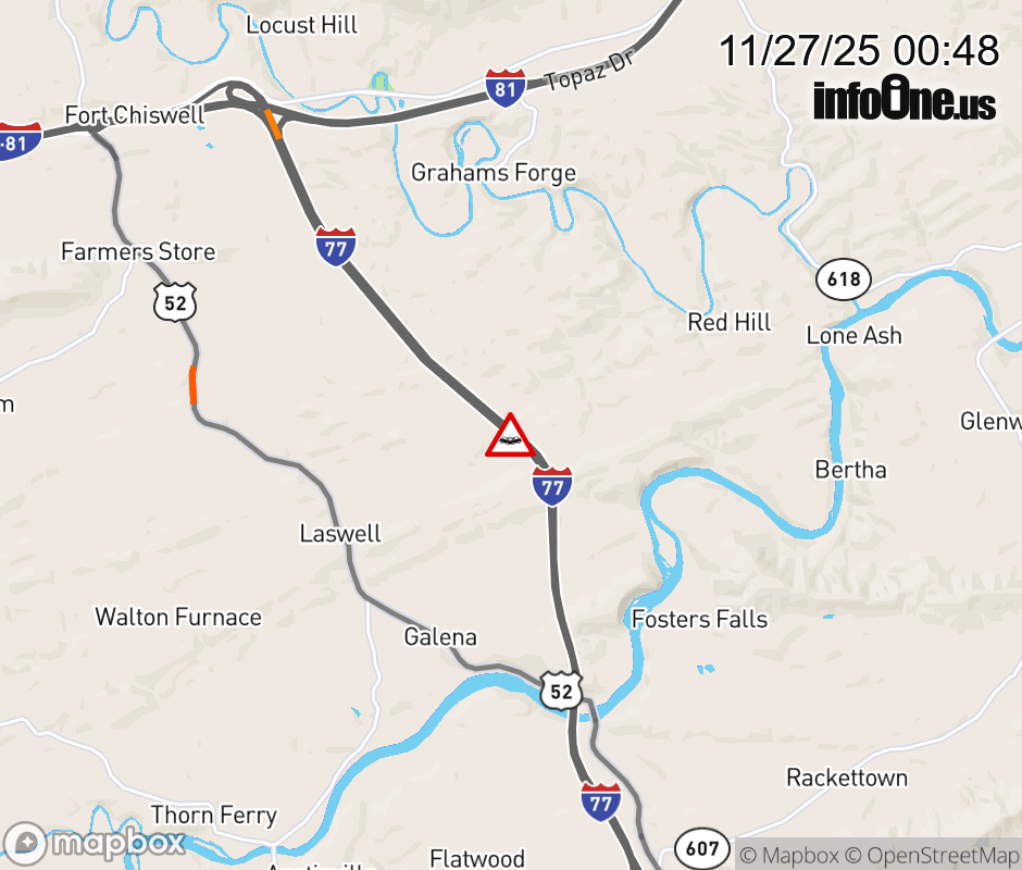 On I-77 at mile marker 28.5 in the County of Wythe, motorists can expect delays due to a vehicle crash. The south left shoulder and left lane are closed. Updated: Thu 11/27/25 12:48 AM EST ![]() |