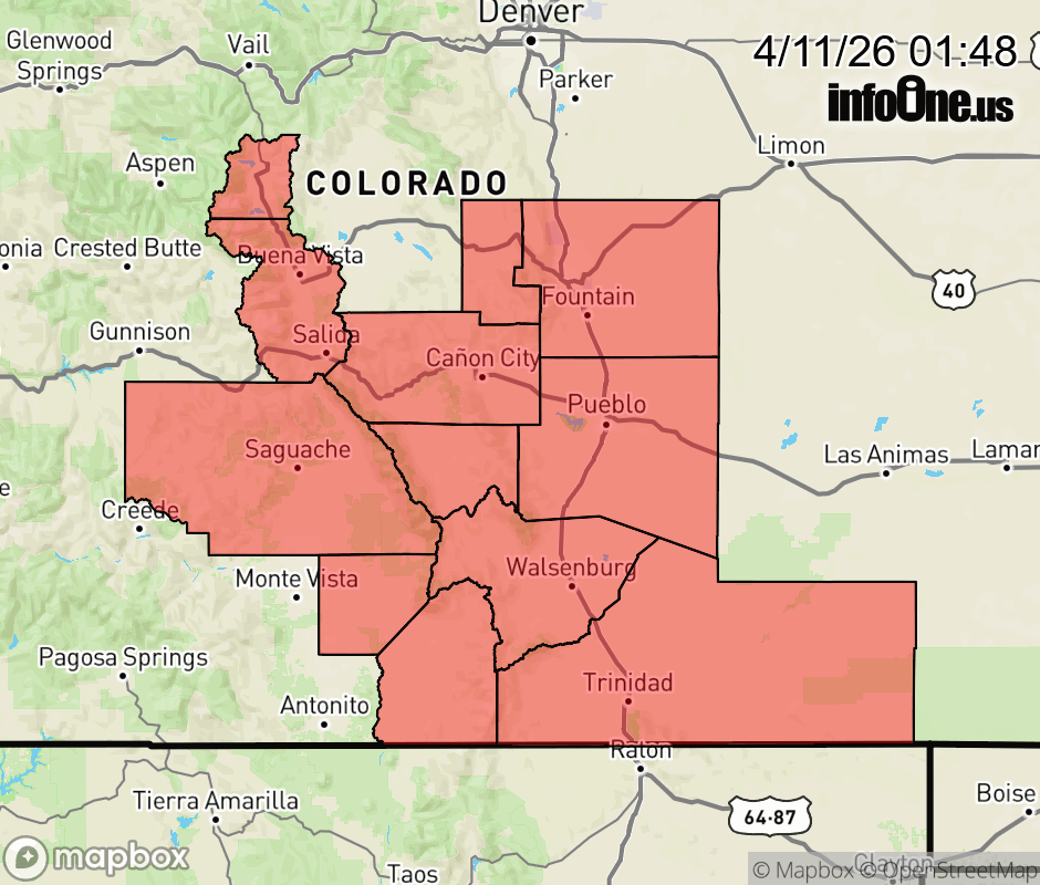 Canceled 4/11/26 2:39 PM Red Flag Warning issued April 10 at 11:47PM MDT until April 12 at 9:00PM MDT by NWS Pueblo CO The National Weather Service in Pueblo has issued a Red Flag Warning for gusty winds and low relative humidity, which is in effect from 11 AM to 9 PM MDT Sunday. The Fire Weather Watch is no longer in effect. * AFFECTED AREA... Fire Weather Zones 220, 221 and 225. * TIMING... From 11 AM to 9 PM MDT Sunday. * WINDS... Southwest 20 to 30 mph with gusts up to 45 mph. * RELATIVE HUMIDITY... As low as 11 percent. * IMPACTS... Elevated fire danger is expected. Fires will catch and spread rapidly and erratically. ![]() |