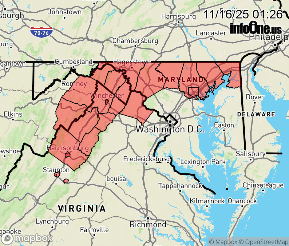 Canceled 11/16/25 5:54 AM Wind Advisory issued November 16 at 1:25AM EST until November 16 at 6:00PM EST by NWS Baltimore MD/Washington DC * WHAT... Northwest winds 20 to 25 mph with gusts up to 50 mph expected. * WHERE... Portions of north central, northeast, and northern Maryland, northern, northwest, and western Virginia, and the eastern panhandle of West Virginia. * WHEN... From 9 AM this morning to 6 PM EST this evening. * IMPACTS... Gusty winds will blow around unsecured objects. Tree limbs could be blown down and a few power outages may result. ![]() |