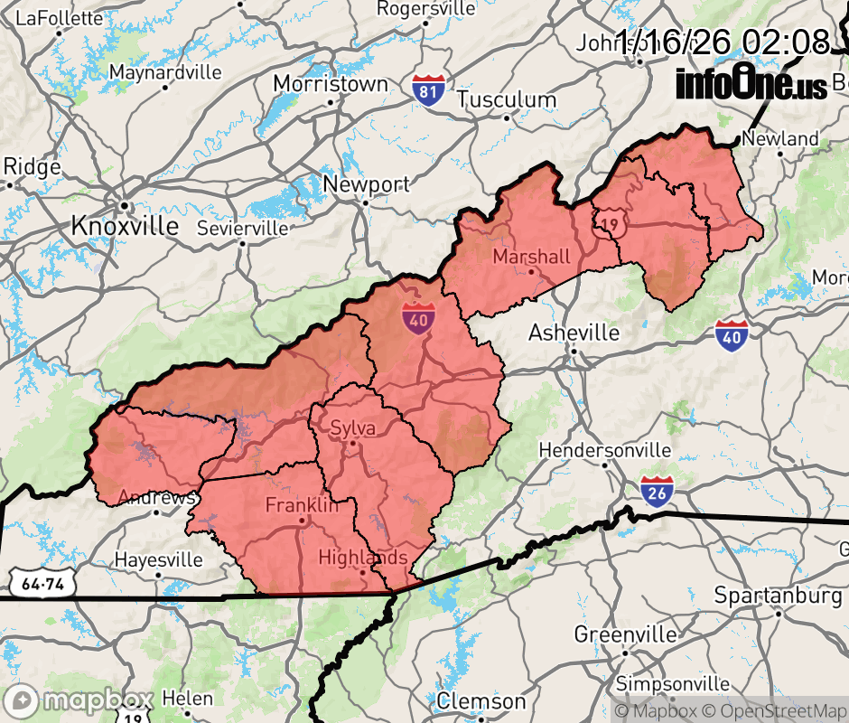 Cold Weather Advisory issued January 16 at 2:06AM EST until January 16 at 7:00AM EST by NWS Greenville-Spartanburg SC * WHAT... Very cold wind chills as low as 10 below above 3500 feet. * WHERE... Graham, Haywood, Macon, Madison, Mitchell, Northern Jackson, Southern Jackson, Swain, and Yancey Counties. * WHEN... Until 7 AM EST this morning. * IMPACTS... The dangerously cold wind chills as low as 10 below zero could result in hypothermia or frostbite if precautions are not taken. ![]() |