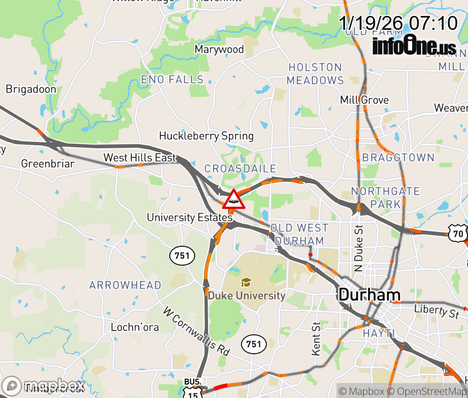 The left lane is closed at Exit 108B (US 70 BUS/Hillsborough Rd). ![]() Updated: Mon 1/19/26 7:10 AM EST |