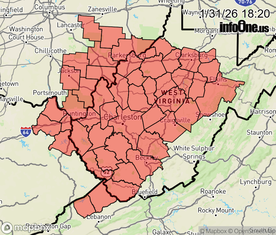 Canceled 1/31/26 11:53 PM Cold Weather Advisory issued January 31 at 6:19PM EST until February 1 at 11:00AM EST by NWS Charleston WV * WHAT... Very cold wind chills as low as 12 below expected. * WHERE... Portions of northeast Kentucky, southeast Ohio, southwest Virginia, and central, northeast, northern, southeast, southern, and western West Virginia. * WHEN... Until 11 AM EST Sunday. * IMPACTS... The cold wind chills as low as 10 below zero could result in hypothermia if precautions are not taken. ![]() |