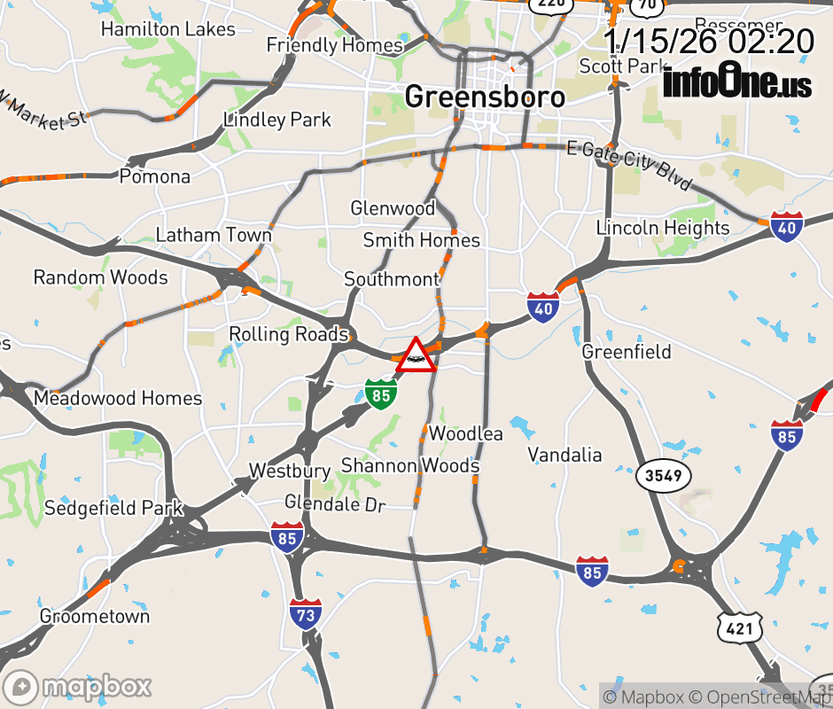 The two right lanes are closed at Exit 220 (Randleman Rd). Updated: Thu 1/15/26 2:20 AM EST ![]() Updated: Thu 1/15/26 2:20 AM EST |