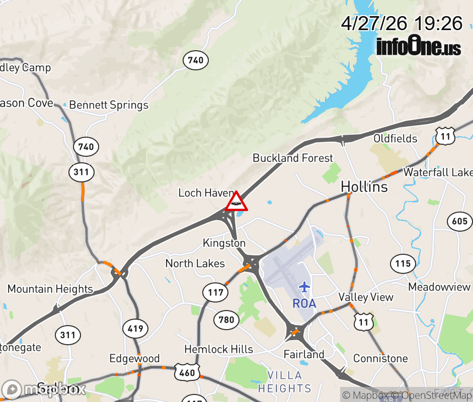 On I-81 at mile marker 144.1 in the County of Roanoke, motorists can expect delays due to a tractor trailer crash. The south exit ramp narrows. Updated: Mon 4/27/26 7:26 PM EDT ![]() Updated: Mon 4/27/26 7:26 PM EDT |