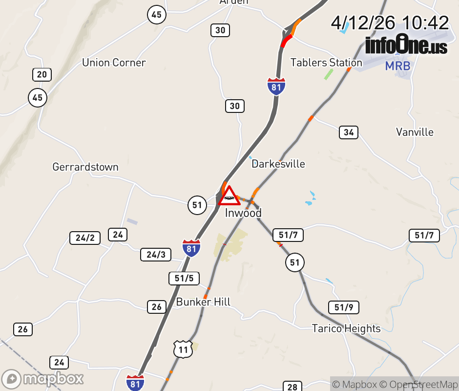 Vehicle Crash on WV-51 (Gerrardstown Rd) & 4700 BLK Dunkin Drive . The northbound road is closed. The southbound road is closed. ![]() |