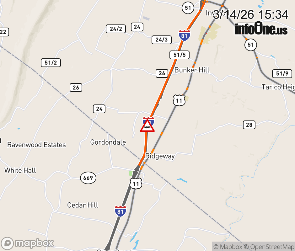 Vehicle Crash on I-81S at Mile Marker 1.0. The southbound right lane is closed. Updated: Sat 3/14/26 3:34 PM EDT ![]() Updated: Sat 3/14/26 3:34 PM EDT |