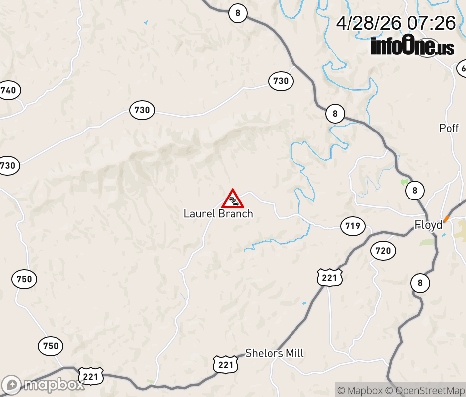 On Rt. 719 in the County of Floyd, in the vicinity of Laurel Branch Rd; Wills Ridge Rd; Wills Ridge Rd NW; Rt. 729N/S (Floyd County), motorists can expect delays due to weather. All east lanes are closed. All west lanes are closed. Updated: Tue 4/28/26 7:26 AM EDT ![]() Updated: Tue 4/28/26 7:26 AM EDT |