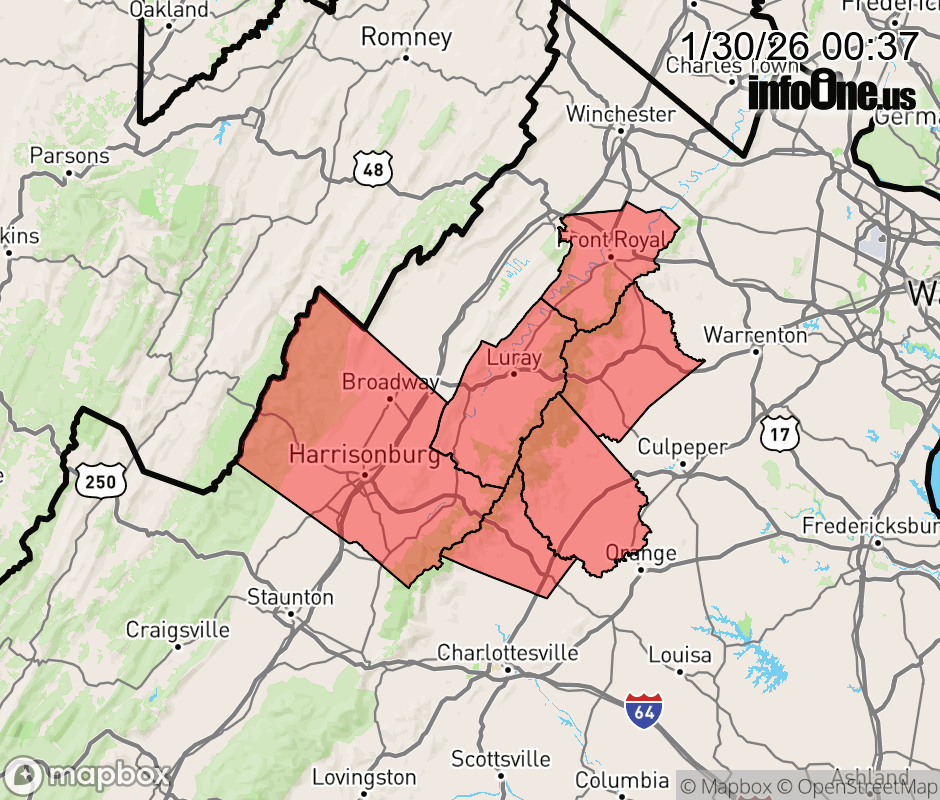 Canceled 1/30/26 7:59 AM Cold Weather Advisory issued January 30 at 12:35AM EST until January 31 at 11:00AM EST by NWS Baltimore MD/Washington DC * WHAT... For the first Cold Weather Advisory, very cold wind chills as low as 9 below. For the second Cold Weather Advisory, very cold wind chills as low as 13 below expected. * WHERE... Northern Virginia Blue Ridge. * WHEN... For the first Cold Weather Advisory, until 11 AM EST this morning. For the second Cold Weather Advisory, from 7 PM this evening to 11 AM EST Saturday. * IMPACTS... The cold wind chills as low as 10 below zero could result in hypothermia if precautions are not taken. Frostbite and hypothermia will occur if unprotected skin is exposed to these temperatures. Wind chill values can lead to hypothermia with prolonged exposure. ![]() |