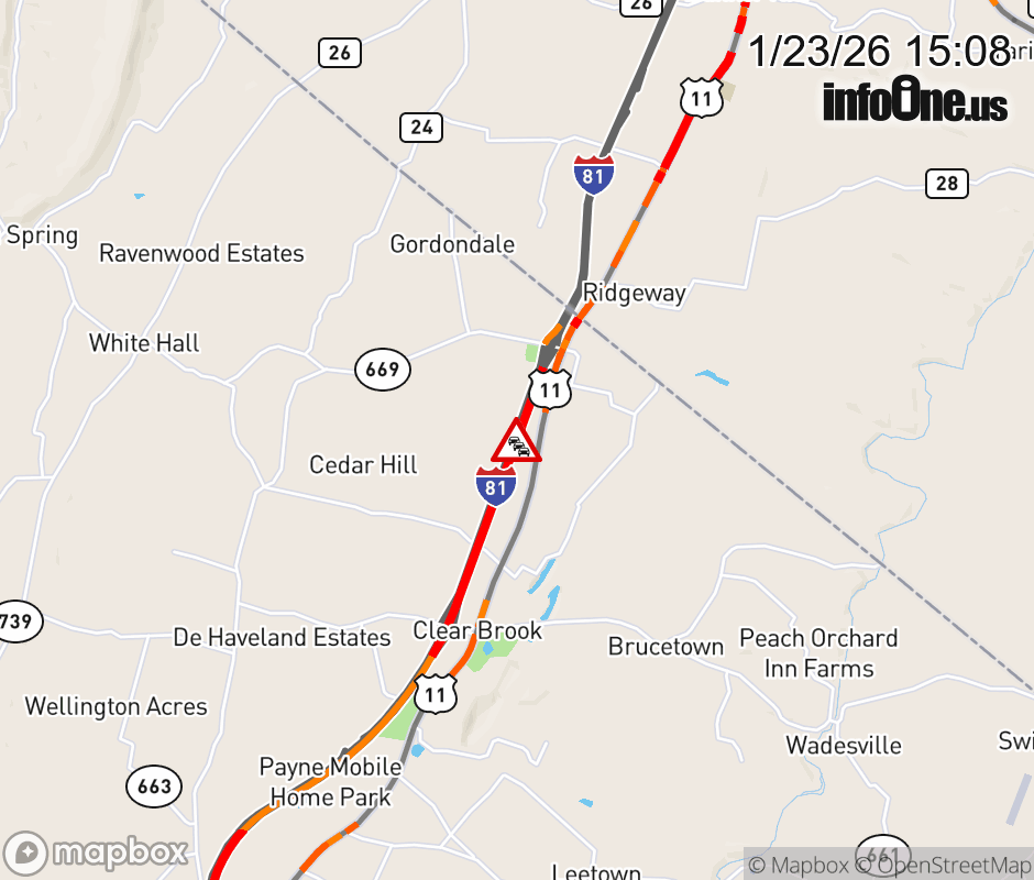 On I-81 North at mile marker 323 in the County of Frederick, motorists can expect delays due to congestion. Traffic backups are approximately 3.5 miles.