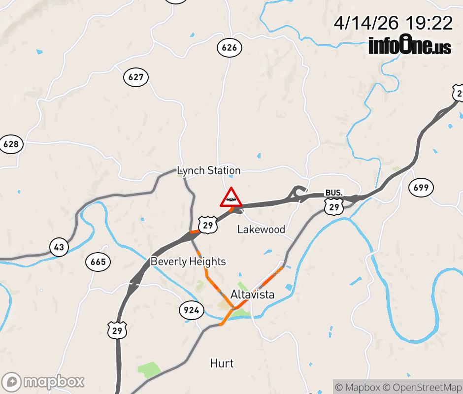 On Rt. 714 North in the County of Campbell, in the vicinity of the ramp to US-29S, motorists can expect delays due to a vehicle crash. Lane closures exist. Updated: Tue 4/14/26 7:22 PM EDT ![]() Updated: Tue 4/14/26 7:22 PM EDT |