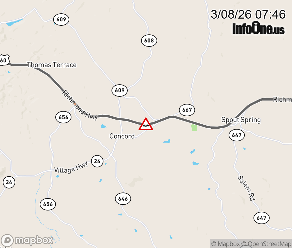On US-460 in the County of Appomattox, in the vicinity of Stage Rd; Rt. 609E/W (Appomattox County); Rt. 609E (Appomattox County), motorists can expect delays due to a vehicle crash. The west right lane and right shoulder are closed. ![]() |