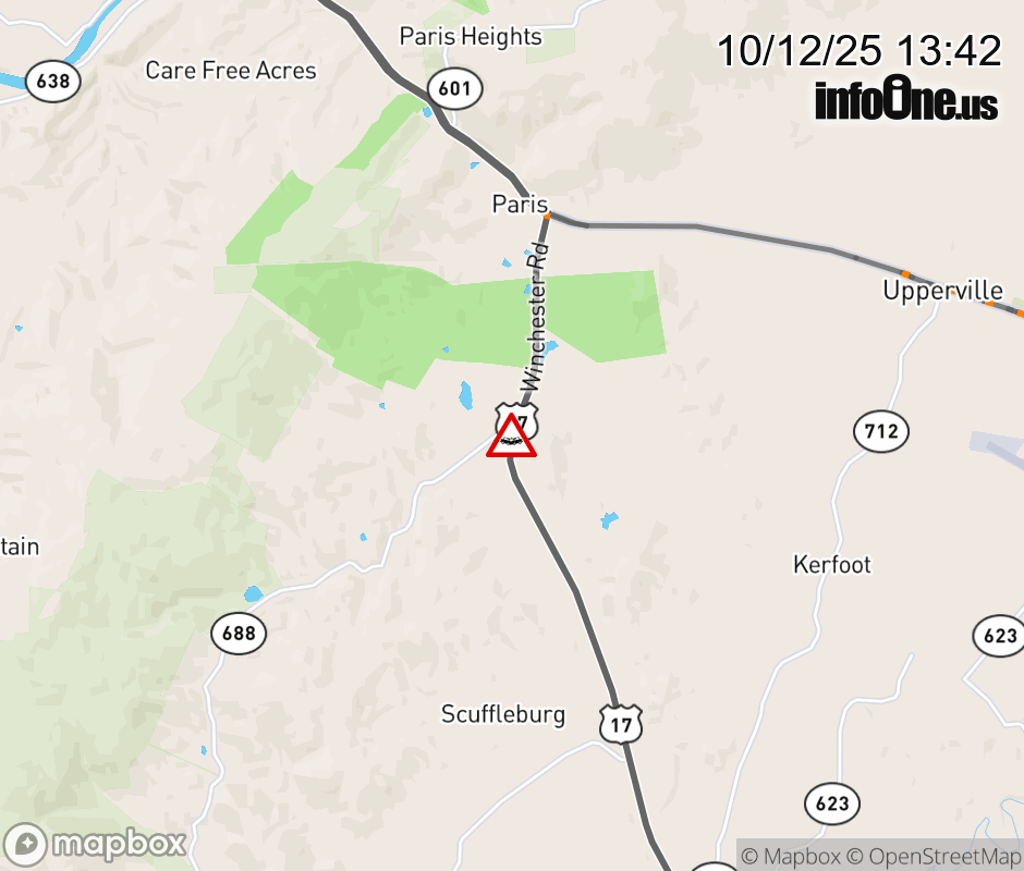 On Rt. 688 North in the County of Fauquier, in the vicinity of Winchester Rd; US-17N/S, motorists can expect delays due to a vehicle crash. Lane closures exist. ![]() |