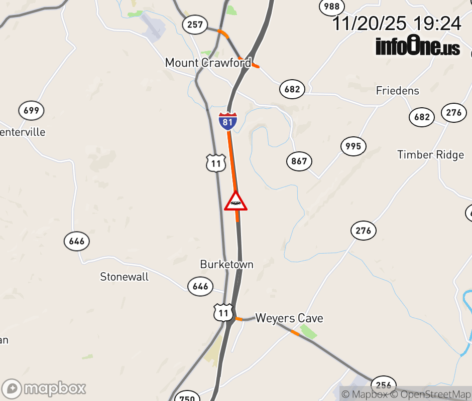 On I-81 at mile marker 237.4 in the County of Rockingham, motorists can expect delays due to a tractor trailer crash. The south right shoulder is closed. Traffic backups are approximately 1.0 mile. Updated: Thu 11/20/25 7:24 PM EST ![]() Updated: Thu 11/20/25 7:24 PM EST |