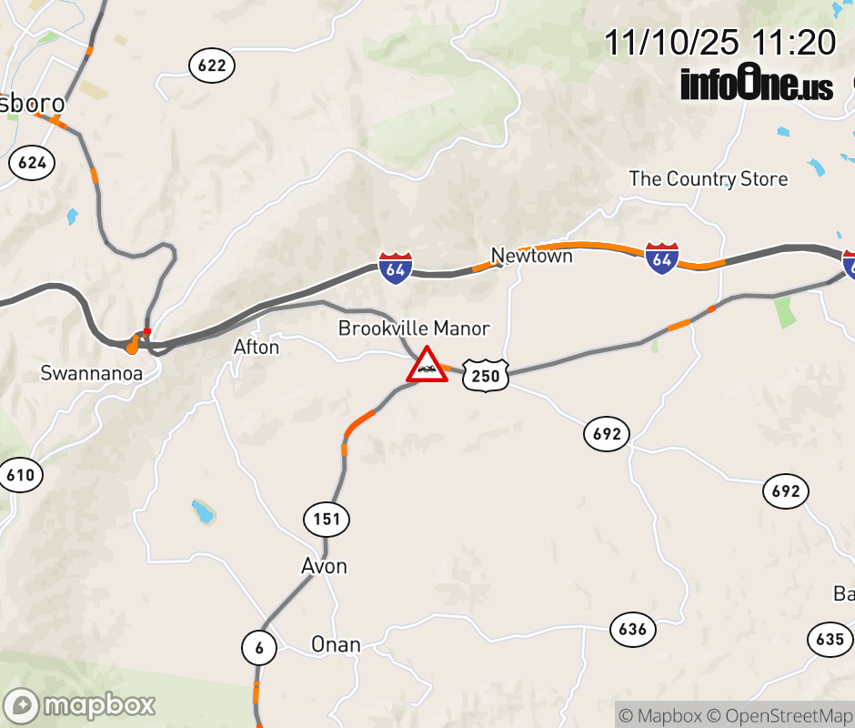 On US-250 in the County of Albemarle, in the vicinity of Critzers Shop Rd; VA-151N/S, motorists can expect delays due to a disabled vehicle. All west lanes are closed. ![]() |