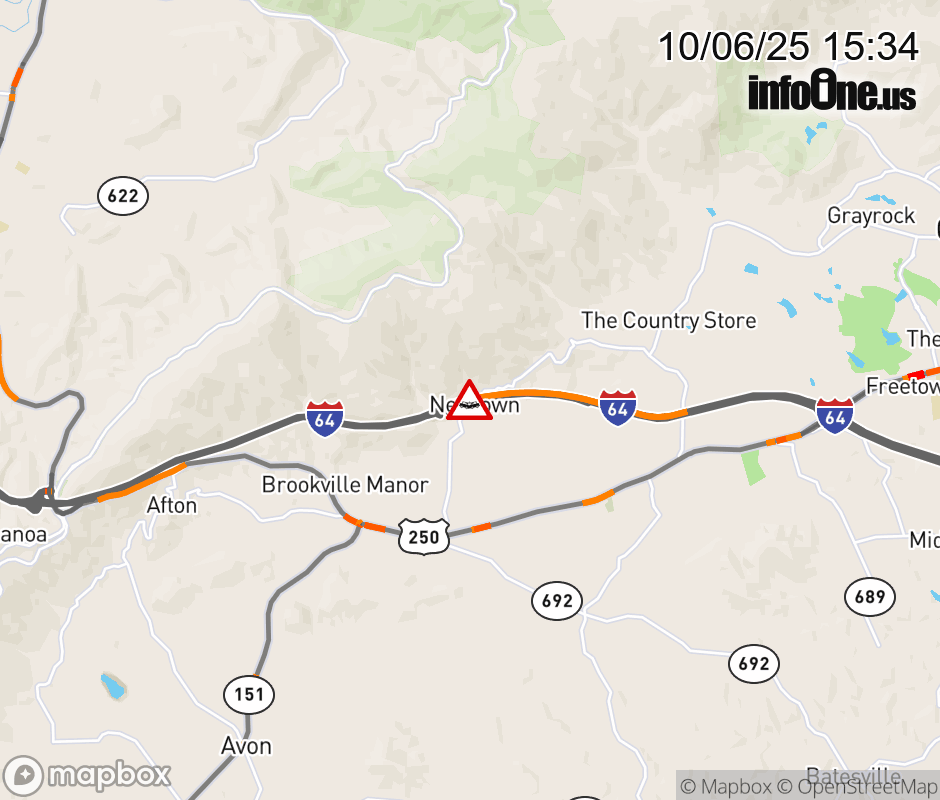 On I-64 at mile marker 104 in the County of Albemarle, motorists can expect delays due to a vehicle crash. The east right lane and right shoulder are closed. Updated: Mon 10/6/25 3:34 PM EDT ![]() Updated: Mon 10/6/25 3:34 PM EDT |