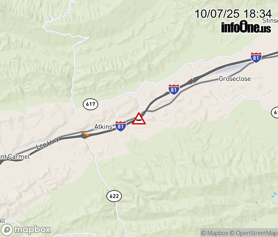 On I-81 at mile marker 52.7 in the County of Smyth, motorists can expect delays due to a tractor trailer crash. The north right shoulder is closed. Traffic backups are approximately 2.0 miles. Updated: Tue 10/7/25 6:34 PM EDT ![]() Updated: Tue 10/7/25 6:34 PM EDT |