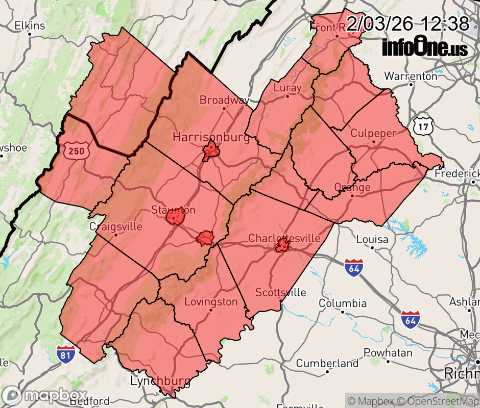 Canceled 2/3/26 8:00 PM Special Weather Statement issued February 3 at 12:37PM EST by NWS Baltimore MD/Washington DC * WHAT... Snow. Total snow accumulations of less than 1 inch, with locally higher amounts of 1 to 2 inches possible especially for elevations above 1500 feet. * WHERE... Eastern Highland/Pendleton Counties, the central Shenandoah Valley, central Virginia piedmont, and central and northern Virginia Blue Ridge Mountains. * WHEN... From 7 PM this evening to 5 AM EST Wednesday. * IMPACTS... Plan on slippery road conditions. ![]() |