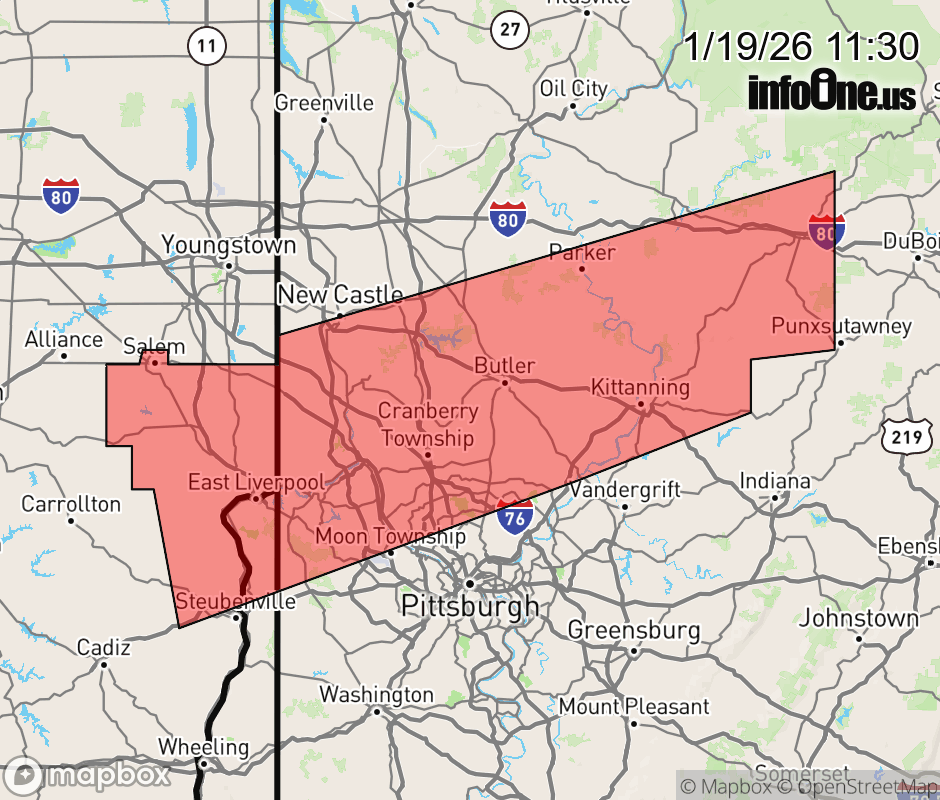 Canceled 1/19/26 12:00 PM Snow Squall Warning issued January 19 at 11:29AM EST until January 19 at 12:30PM EST by NWS Pittsburgh PA The National Weather Service in Pittsburgh has issued a * Snow Squall Warning for... Columbiana County in east central Ohio... Northeastern Jefferson OH County in east central Ohio... Northern Allegheny County in southwestern Pennsylvania... Northwestern Washington County in southwestern Pennsylvania... Armstrong County in west central Pennsylvania... Butler County in west central Pennsylvania... Southern Clarion County in west central Pennsylvania... Western Jefferson PA County in west central Pennsylvania... Beaver County in western Pennsylvania... Southern Lawrence County in western Pennsylvania... Hancock County in northern West Virginia... * Until 1230 PM EST. * At 1129 AM EST, a dangerous snow squall was located along a line from 8 miles southeast of Clarion to 10 miles west of Wellsville, moving east at 40 mph. HAZARD...Intense bursts of heavy snow and gusty winds leading to blowing snow and rapidly falling visibility. Wind gusts greater than 35 mph. SOURCE...Doppler radar and webcams. IMPACT...Travel will become difficult and potentially dangerous within minutes. * Locations impacted include... McCandless Township, Cranberry, Moon Township, New Castle, Weirton, Steubenville, Butler, Franklin Park, Salem, East Liverpool, Aliquippa, Beaver Falls, Columbiana, Punxsutawney, Monaca, Clarion, East Palestine, Kittanning, Brookville and Wellsville. This includes the following highways... Parkway North between mile markers 11 and 13. Interstate 80 in Pennsylvania between mile markers 59 and 85. Interstate 79 in Pennsylvania between mile markers 69 and 106. Interstate 376 between mile markers 16 and 52. Pennsylvania Turnpike between mile markers 1 and 40. ![]() |
