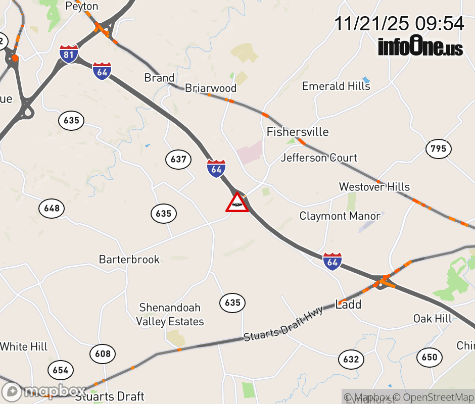 On VA-285 in the County of Augusta, in the vicinity of I-64E Ramp 91A; VA-285U Ramp 0A, motorists can expect delays due to a vehicle crash. The south right lane and right shoulder are closed. ![]() |