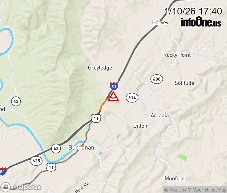 On Rt. 614 in the County of Botetourt, in the vicinity of Chapel Rd; Long View Ln; Stinnett Rd; Rt. 624N/S (Botetourt County), motorists can expect delays due to a vehicle crash. All north lanes are closed. All south lanes are closed. ![]() |