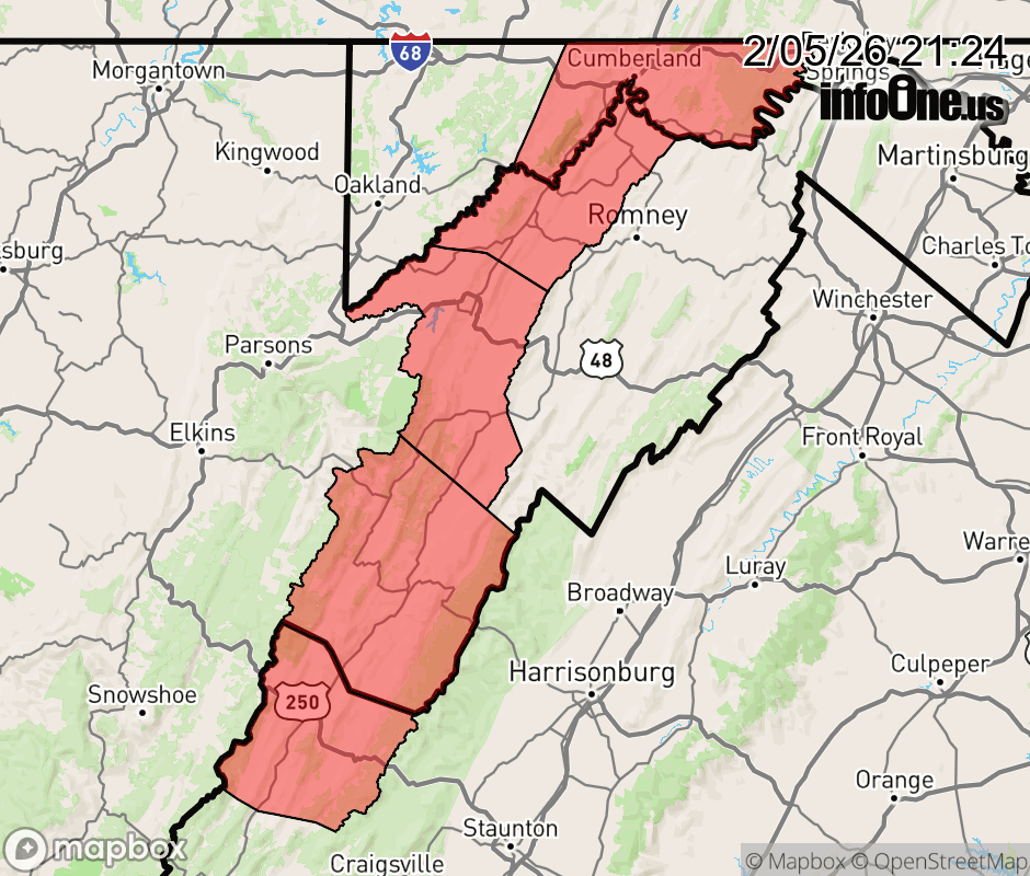 Canceled 2/6/26 1:57 AM Extreme Cold Watch issued February 5 at 9:23PM EST until February 8 at 10:00AM EST by NWS Baltimore MD/Washington DC * WHAT... For the High Wind Watch, northwest winds 20 to 30 mph with gusts up to 60 mph possible. For the Extreme Cold Watch, dangerously cold wind chills as low as 20 degrees below zero possible. * WHERE... In Maryland, Central and Eastern Allegany County. In Virginia, Eastern Highland County. In West Virginia, Eastern Grant, Eastern Mineral, and Eastern Pendleton Counties. * WHEN... For the High Wind Watch, from late Friday night through Saturday evening. For the Extreme Cold Watch, from late Friday night through Sunday morning. * IMPACTS... Damaging winds could blow down trees and power lines. Widespread power outages are possible. Travel could be difficult, especially for high profile vehicles. The dangerously cold wind chills as low as 20 below zero could cause hypothermia and frostbite on exposed skin in as little as 30 minutes. * ADDITIONAL DETAILS... Wind chills will remain at or below zero during the day on Saturday due to windy conditions and cold temperatures. ![]() |