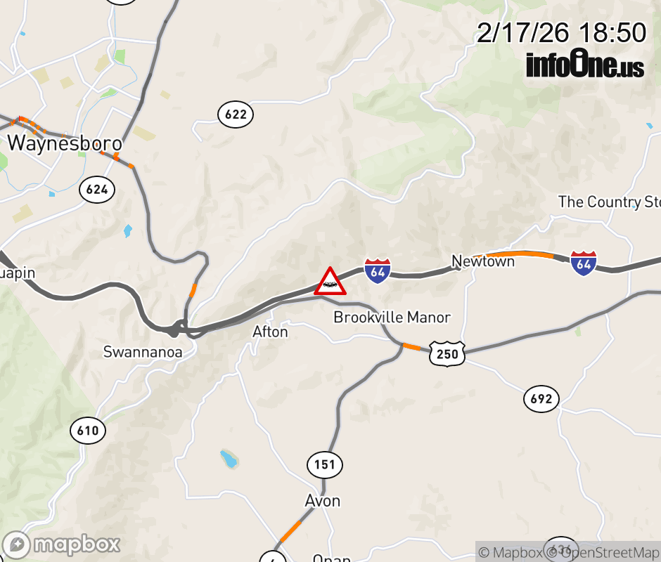On I-64 West at mile marker 101.8 in the County of Albemarle, motorists can expect delays due to a multi-vehicle crash. Traffic backups are approximately 4.0 miles. Updated: Tue 2/17/26 6:50 PM EST ![]() Updated: Tue 2/17/26 6:50 PM EST |