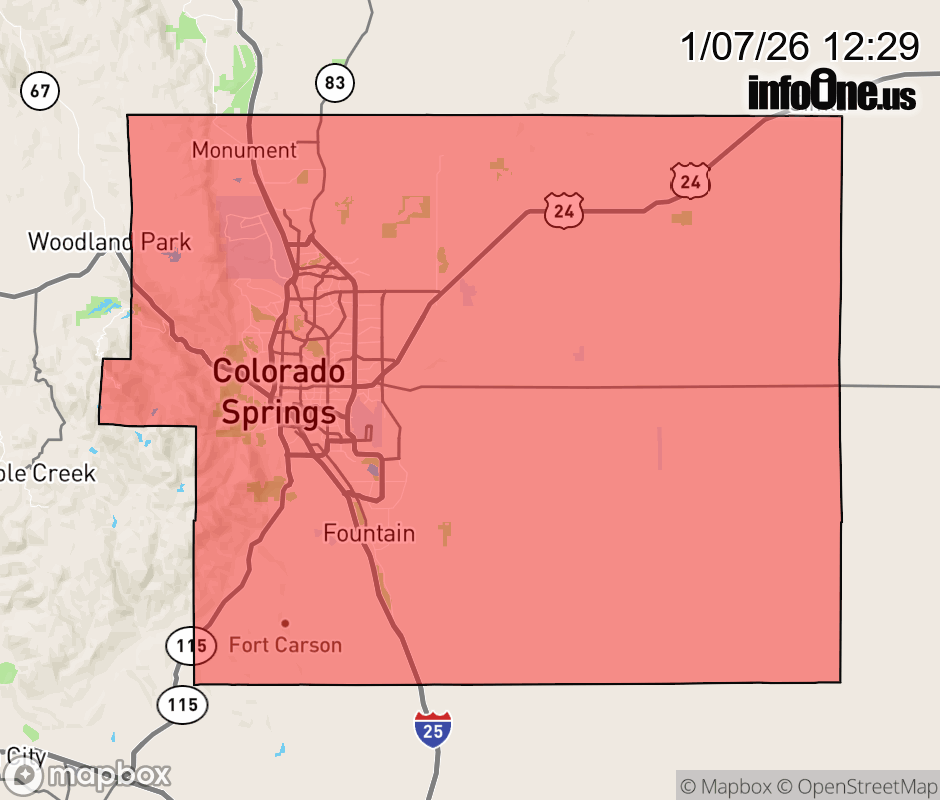 Canceled 1/7/26 4:07 PM Winter Storm Watch issued January 7 at 10:27AM MST until January 9 at 11:00AM MST by NWS Pueblo CO * WHAT... Heavy snow possible. Total snow accumulations between 5 and 7 inches possible. Winds could gust as high as 40 mph. * WHERE... Northern El Paso. * WHEN... From Thursday afternoon through Friday morning. * IMPACTS... Travel could be very difficult. The hazardous conditions could impact the Thursday evening and Friday morning commutes. ![]() |