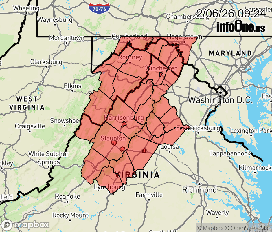 Canceled 2/6/26 3:30 PM Special Weather Statement issued February 6 at 9:23AM EST by NWS Baltimore MD/Washington DC * WHAT... Light snow likely. Total snow accumulations up to 1 inch, with locally higher amounts of 1 to 2 inches possible along the ridges. * WHERE... Shenandoah Valley of Virginia, eastern West Virginia, western Maryland and central Virginia. * WHEN... From 12 PM this afternoon to 6 PM this evening. * IMPACTS... Plan on slippery road conditions this afternoon and evening. ![]() |