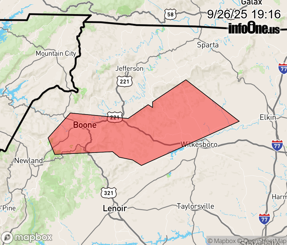 Canceled 9/26/25 10:15 PM Flood Advisory issued September 26 at 7:14PM EDT until September 26 at 10:15PM EDT by NWS Blacksburg VA * WHAT... Flooding caused by excessive rainfall is expected. * WHERE... A portion of northwest North Carolina, including the following counties, Watauga and Wilkes. * WHEN... Until 1015 PM EDT. * IMPACTS... Minor flooding in low-lying and poor drainage areas. * ADDITIONAL DETAILS... - At 714 PM EDT, Doppler radar indicated heavy rain due to thunderstorms. Minor flooding is ongoing or expected to begin shortly in the advisory area. Between 1 and 2 inches of rain have fallen. - This includes the following streams and drainages... Darnell Creek, Big Bugaboo Creek, Dutch Creek, Elk Creek, Clear Branch, Bee Tree Branch, East Prong Roaring River, Brushy Fork, Craborchard Creek, Dugger Creek, Fall Creek, Camp Branch, Cane Creek and Church Branch. Additional rainfall amounts up to 1 inch are expected over the area. This additional rain will result in minor flooding. - Some locations that will experience flooding include... Boone... North Wilkesboro... Wilkesboro... Blowing Rock... Wilbar... Deep Gap... Mc Grady... - http://www.weather.gov/safety/flood ![]() |