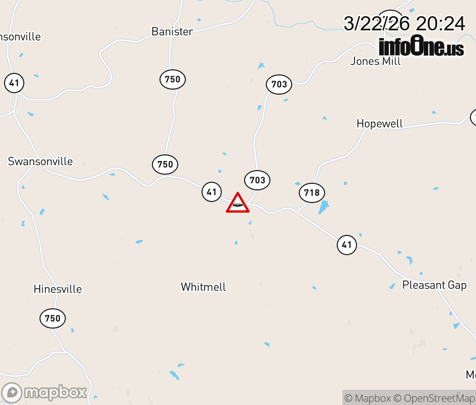 On VA-41 North in the County of Pittsylvania, in the vicinity of F C Beverly Rd; Rt. 703N/S (Pittsylvania County); /F. C. BEVERLY ROAD, motorists can expect delays due to a vehicle crash. Lane closures exist. Updated: Sun 3/22/26 8:24 PM EDT ![]() Updated: Sun 3/22/26 8:24 PM EDT |