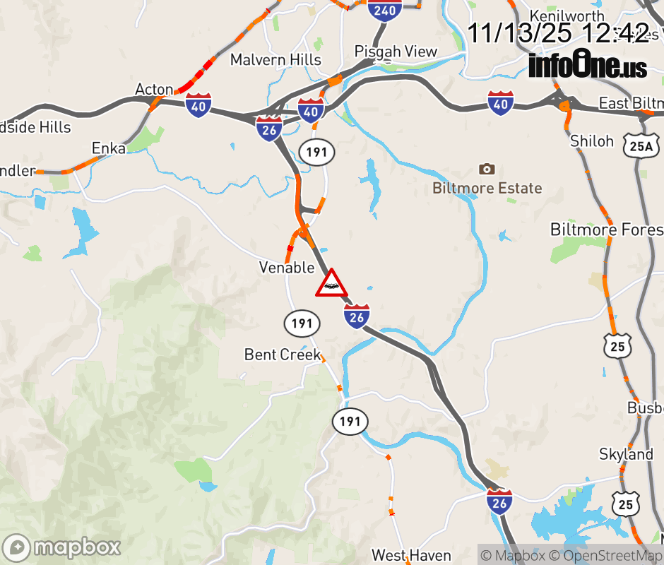 The left lane is closed 1 mile before Exit 33, NC 191 (Brevard Road). ![]() |