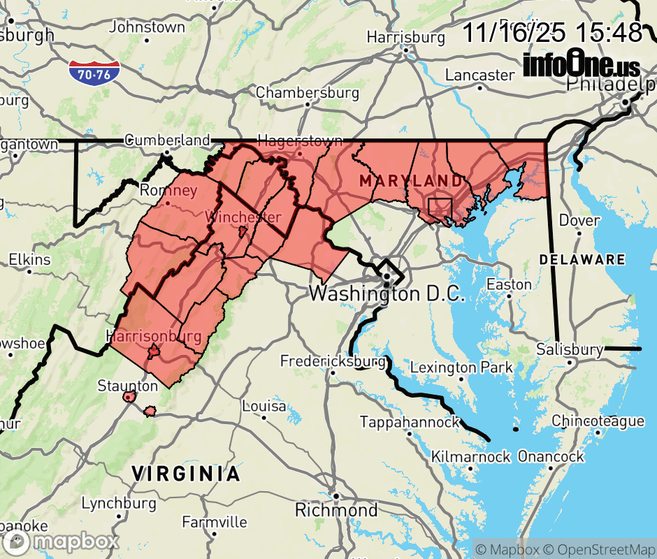 Canceled 11/16/25 5:12 PM Wind Advisory issued November 16 at 3:47PM EST until November 16 at 6:00PM EST by NWS Baltimore MD/Washington DC * WHAT... Northwest winds 20 to 30 mph with gusts up to 50 mph. * WHERE... Portions of north central, northeast, and northern Maryland, northern, northwest, and western Virginia, and eastern West Virginia. * WHEN... Until 6 PM EST this evening. * IMPACTS... Gusty winds will blow around unsecured objects. Tree limbs could be blown down and a few power outages may result. ![]() |