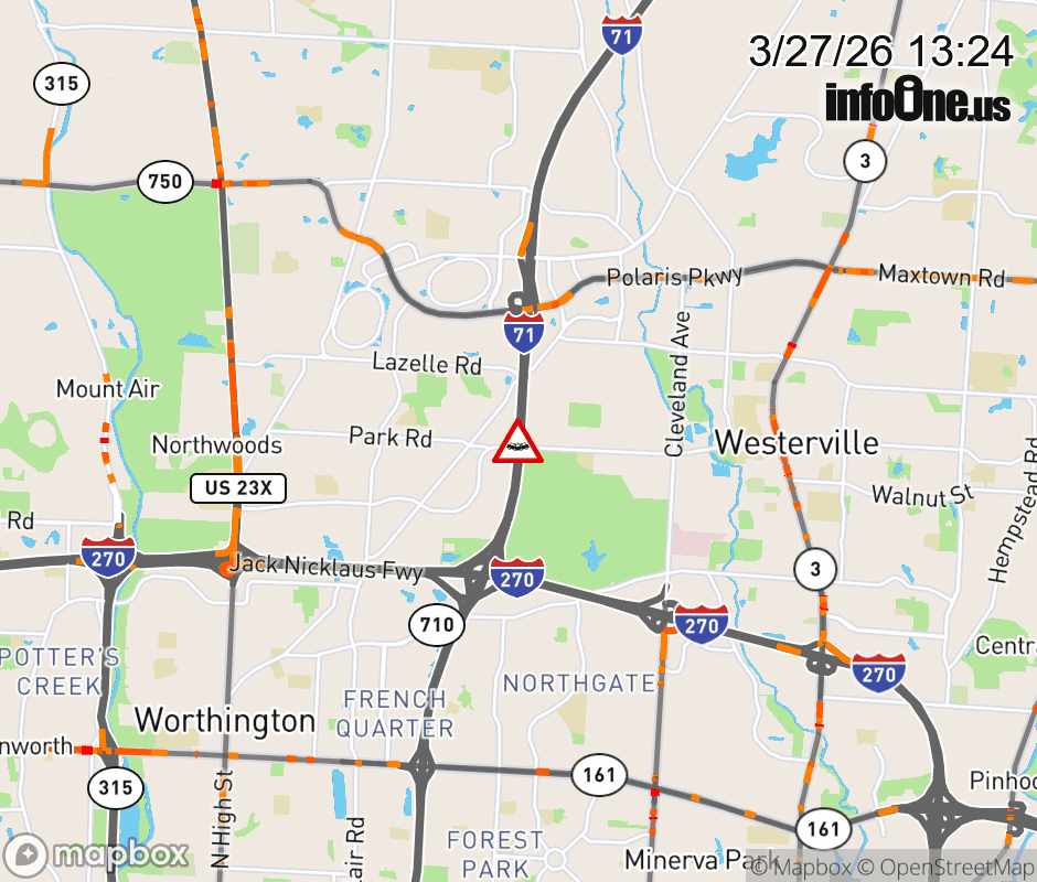 The 4 left lanes are blocked on I-71 South beyond Gemini Place To Polaris Pkwy, due to a crash. Updated: Fri 3/27/26 1:24 PM EDT ![]() Updated: Fri 3/27/26 1:24 PM EDT |
