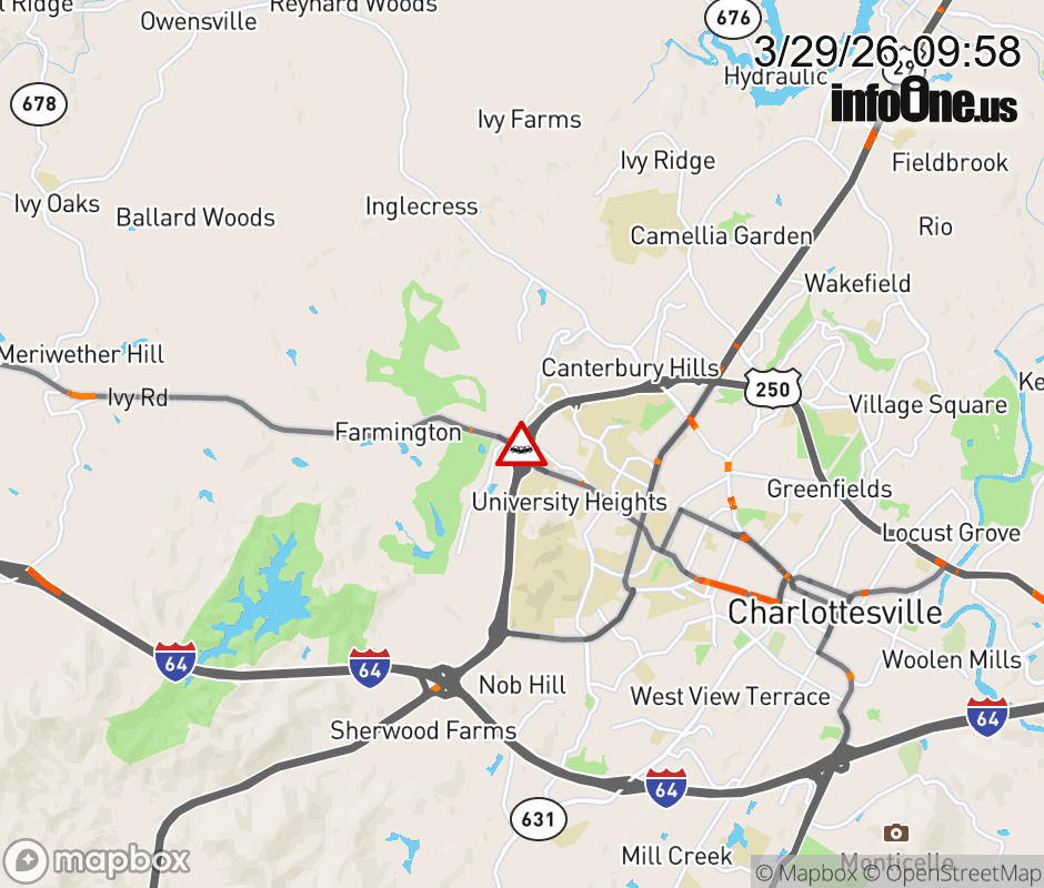 On Rt. 855 in the County of Albemarle, in the vicinity of Old Ivy Rd; Rt. 601N/S (Albemarle County), motorists can expect delays due to a vehicle crash. All north lanes are closed. All south lanes are closed. Updated: Sun 3/29/26 9:58 AM EDT ![]() Updated: Sun 3/29/26 9:58 AM EDT |