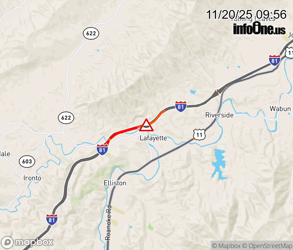 On I-81 at mile marker 129.7 in the County of Montgomery, motorists can expect delays due to a multi-vehicle crash. The north right shoulder is closed. Updated: Thu 11/20/25 9:56 AM EST ![]() Updated: Thu 11/20/25 9:56 AM EST |