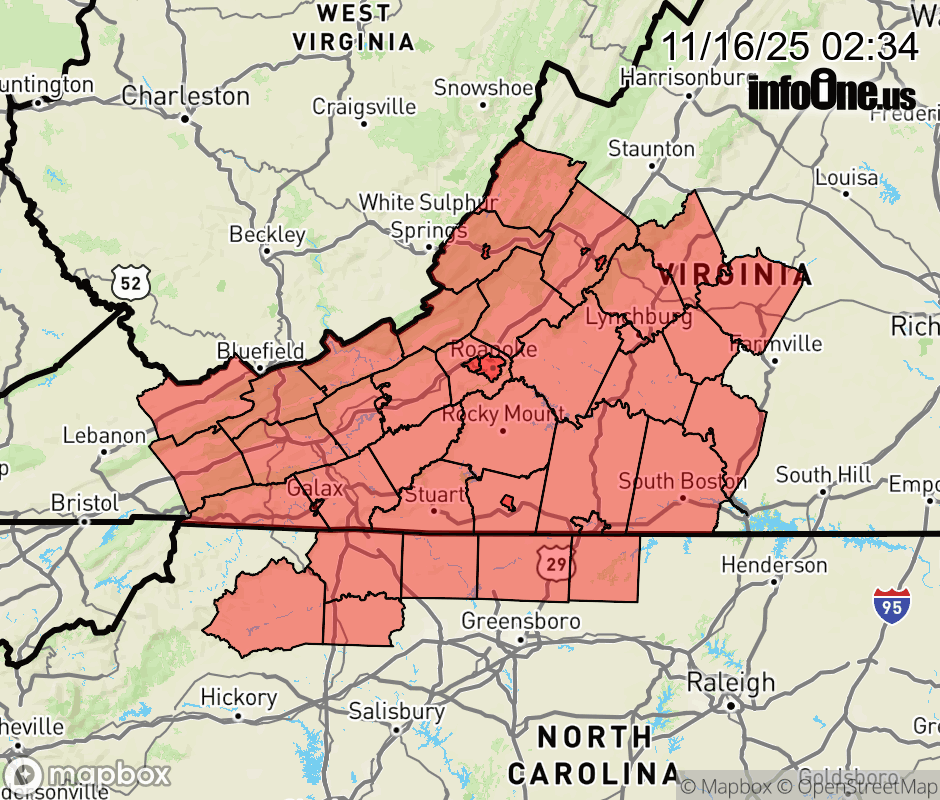 Red Flag Warning issued November 16 at 2:32AM EST until November 16 at 6:00PM EST by NWS Blacksburg VA ...DANGEROUS FIRE WEATHER CONDITIONS POSSIBLE TODAY... .Gusty winds combined with low relative humidity and dry fuels will result in the potential for dangerous fire behavior this afternoon and evening. The National Weather Service in Blacksburg has issued a Red Flag Warning for gusty winds and low relative humidities, which is in effect from 11 AM this morning to 6 PM EST this evening. The Fire Weather Watch is no longer in effect. * AFFECTED AREA... Central, western, and southwest Virginia, and north central North Carolina * TIMING...From late morning into the early evening. * WINDS... Northwest 15 to 25 mph with gusts up to 45 mph. * RELATIVE HUMIDITY... As low as 20 percent. * TEMPERATURES... Up to 69. * LIGHTNING... None. * IMPACTS... Gusty winds, dry fuels, and low relative humidity values will be favorable for rapid fire growth. ![]() |
