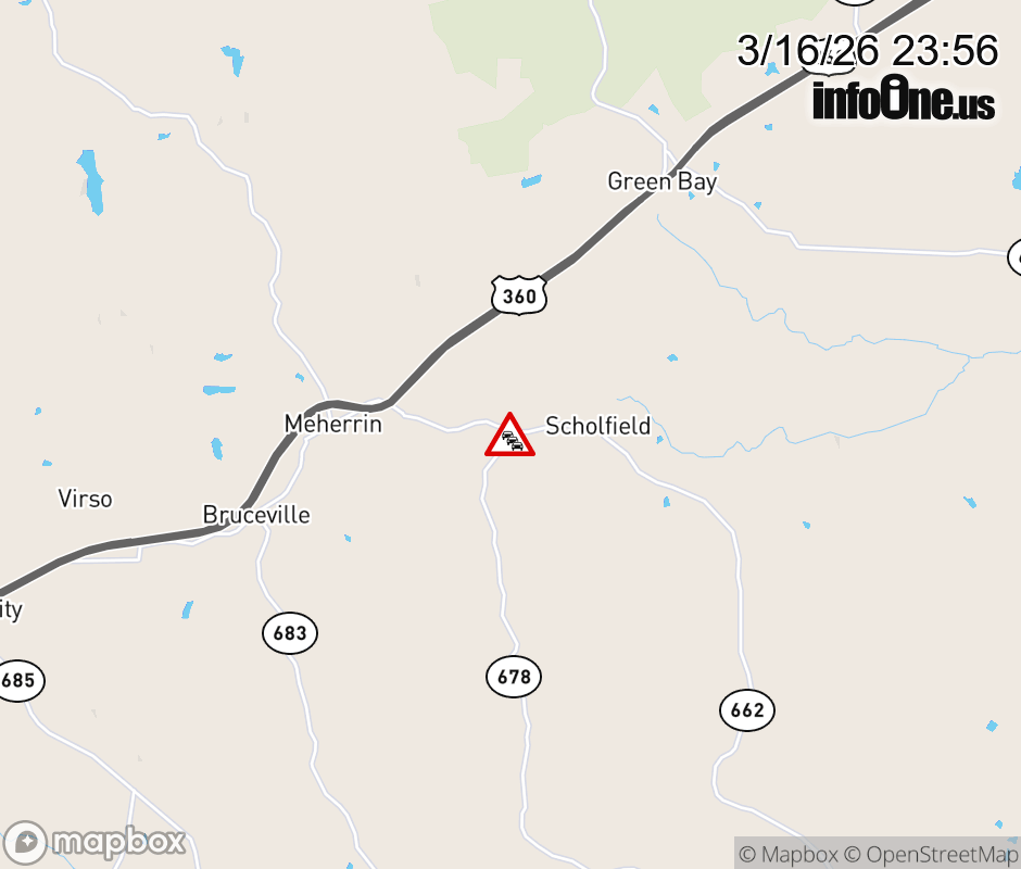 On Rt. 678 North in the County of Lunenburg, in the vicinity of Free State Rd; Rt. 630N/S (Prince Edward County); County/City/Town Line: @ LUNENBURG - PRINCE EDWARD COUNTY LINE, motorists can expect delays due to weather. Updated: Mon 3/16/26 11:56 PM EDT ![]() Updated: Mon 3/16/26 11:56 PM EDT |