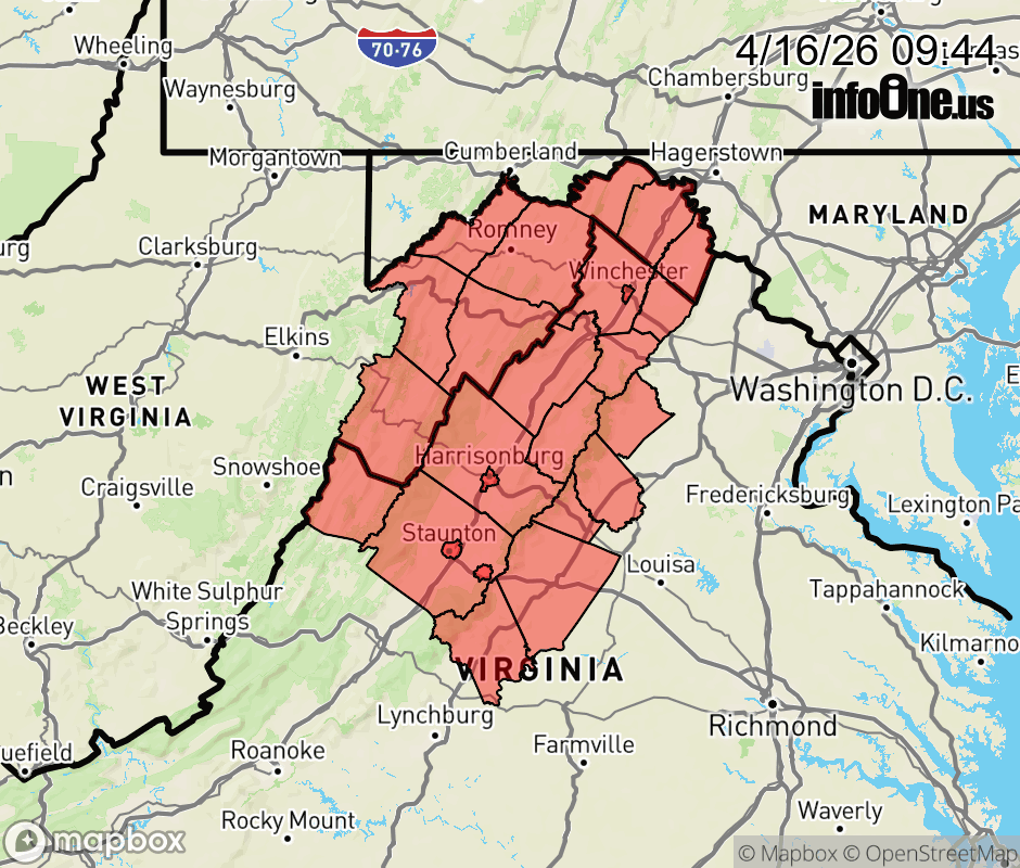 Red Flag Warning issued April 16 at 9:43AM EDT until April 16 at 7:00PM EDT by NWS Baltimore MD/Washington DC The National Weather Service in Baltimore MD/Washington has issued a Red Flag Warning for the combination of hot, dry, and windy conditions, which is in effect until 7 PM EDT this evening. * TIMING... Until 7 PM EDT this evening. * WINDS... Southwest 10 to 15 mph with frequent gusts up to 25 mph. * RELATIVE HUMIDITY... As low as 20 percent. * IMPACTS... Any fire that develops will catch and spread quickly. Outdoor burning is not recommended. * FUEL MOISTURE... 7 to 8 percent. ![]() |