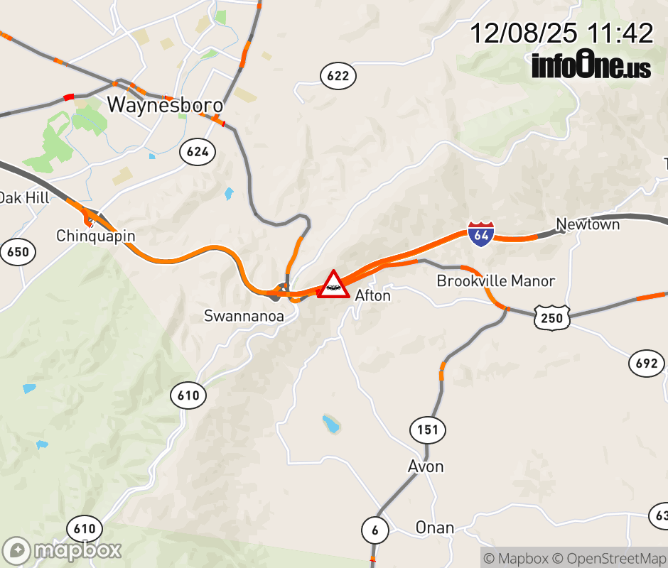 On I-64 at mile marker 100.4 in the County of Albemarle, motorists can expect delays due to a vehicle crash. The west right shoulder is closed. Updated: Mon 12/8/25 11:42 AM EST ![]() Updated: Mon 12/8/25 11:42 AM EST |