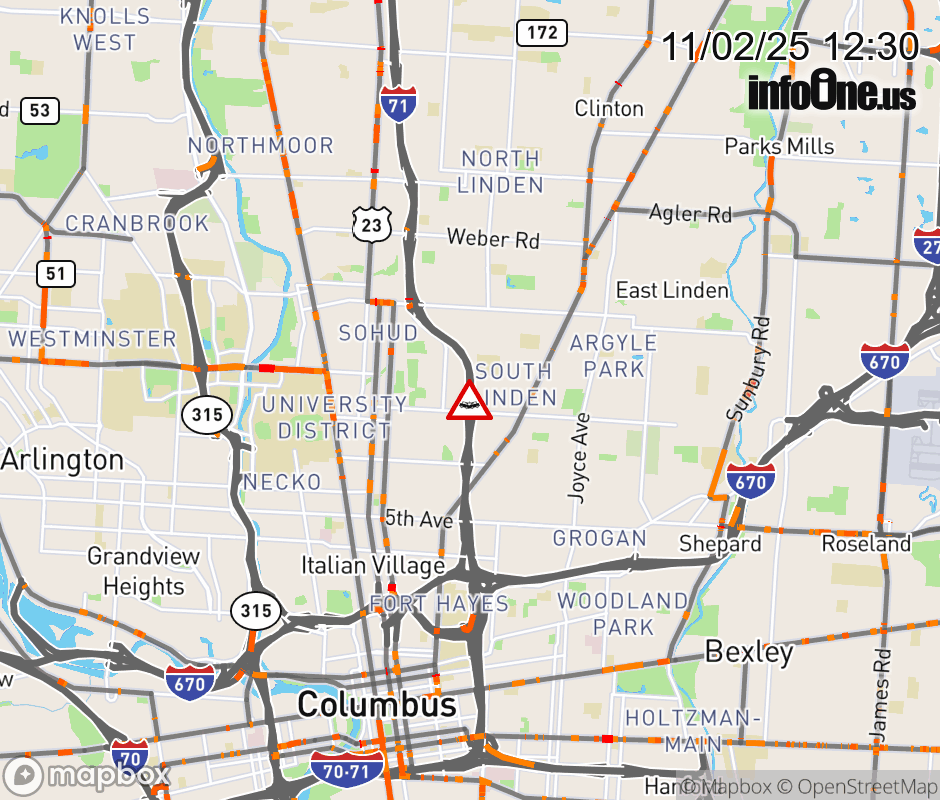 The left lane is blocked on I-71 South at 17th Ave, due to a crash. Updated: Sun 11/2/25 12:30 PM EST ![]()  |